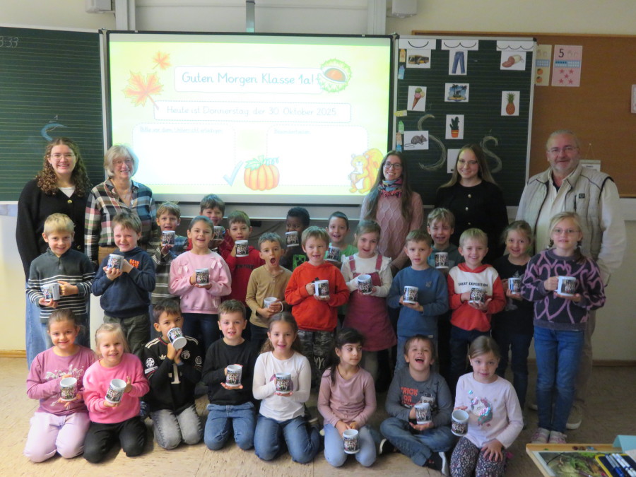 Frau Edhofer erzählte den Kindern mit einem Lächeln, dass man – wenn man gut auf seine Tasse aufpasst – vielleicht sogar mit 18 Jahren noch seinen Kakao oder Tee daraus trinken wird. Die Freude über diese Überraschung war bei den Kindern riesig.